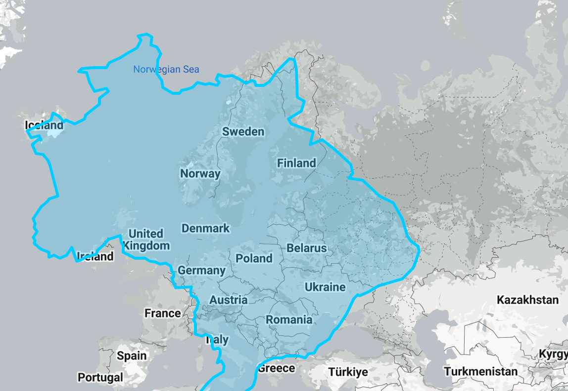 وهذه صورة للبرازيل تظهر مساحة البرازيل مقارنة بمساحة أوروبا. ونقارن البرازيل هنا مع غيرها باعتبارها تقع على خط الاستواء، لذلك تتأثر كثيراً بهذا التشوه.